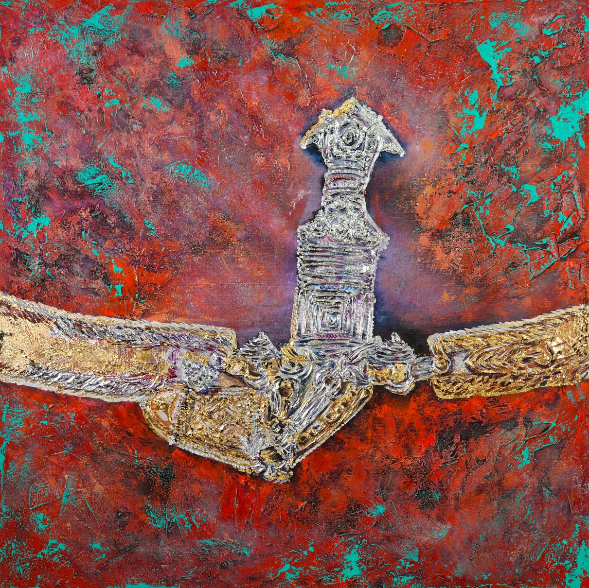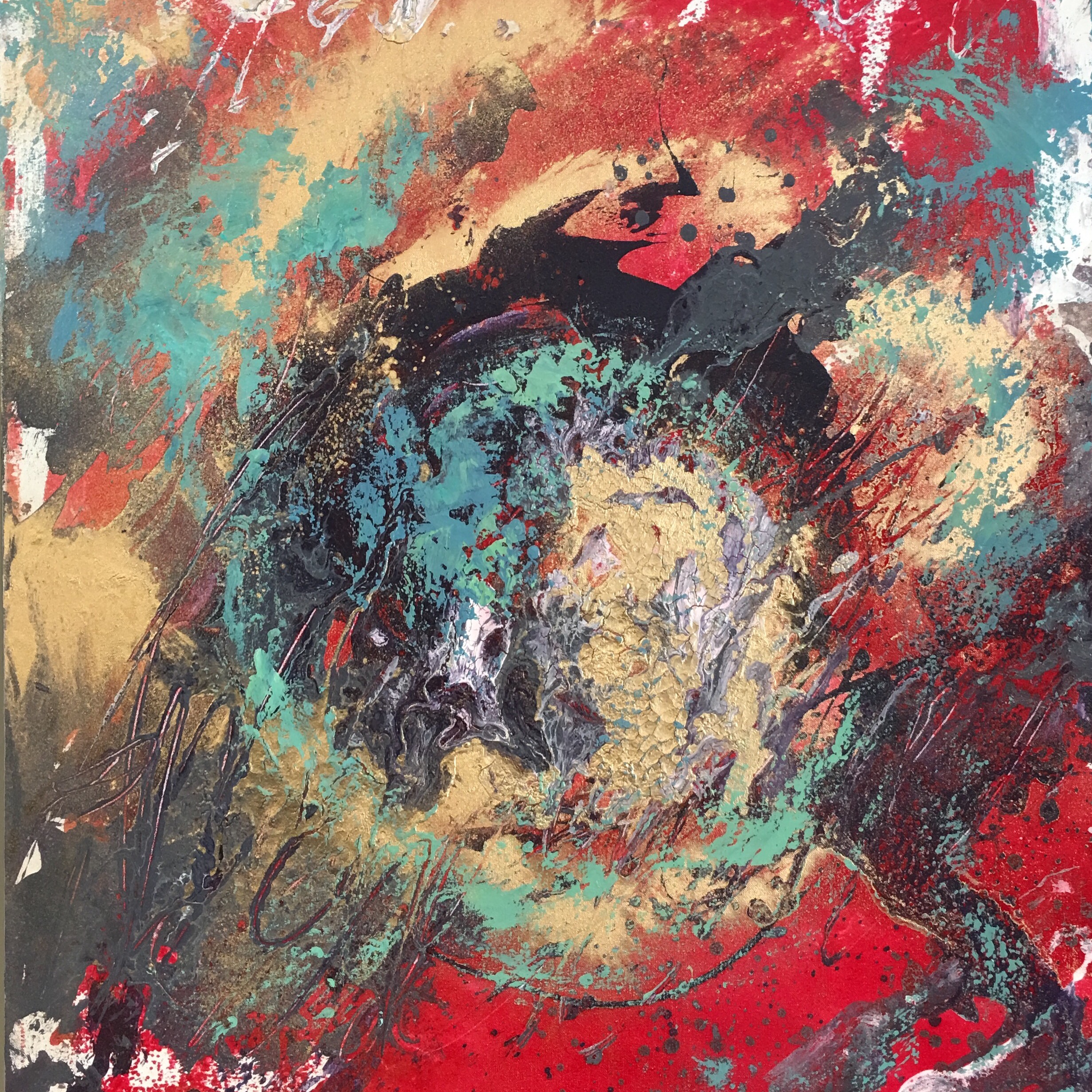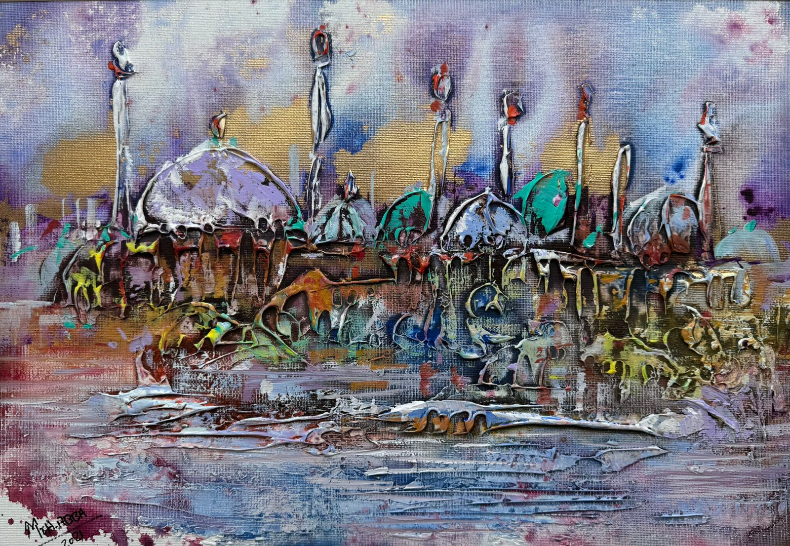 Mahnoush Abbasgholi is a mixed-media artist, with a modern, abstract style. Her preferred medium is acrylic on canvas, incorporating her signature silver and gold leaf, bringing an extra feeling of depth and movement to her paintings.